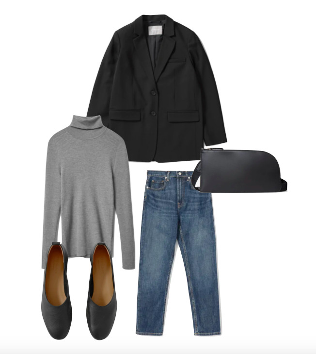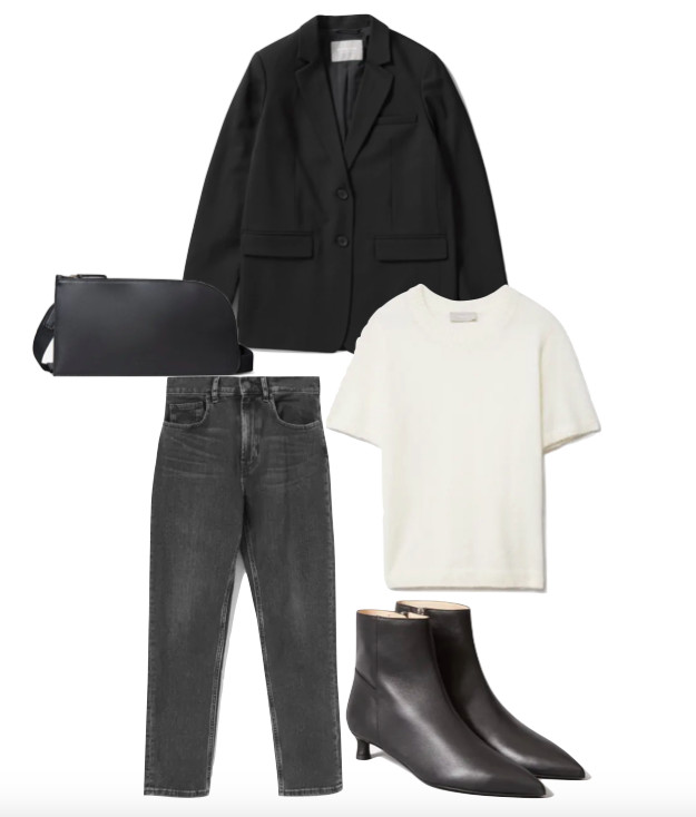 When it comes to restyling pieces I love, like this oversized blazer, I put outfit ideas together using Mac Pages. You can also use PowerPoint, Illustrator, Microsoft Word, or even Canva to create them. Although it is a little time-consuming, I find it to be therapeutic and it helps me avoid making a huge mess when I try on different outfits. Here’s the first outfit idea I created using some of my favorite classic staples by Everlane: